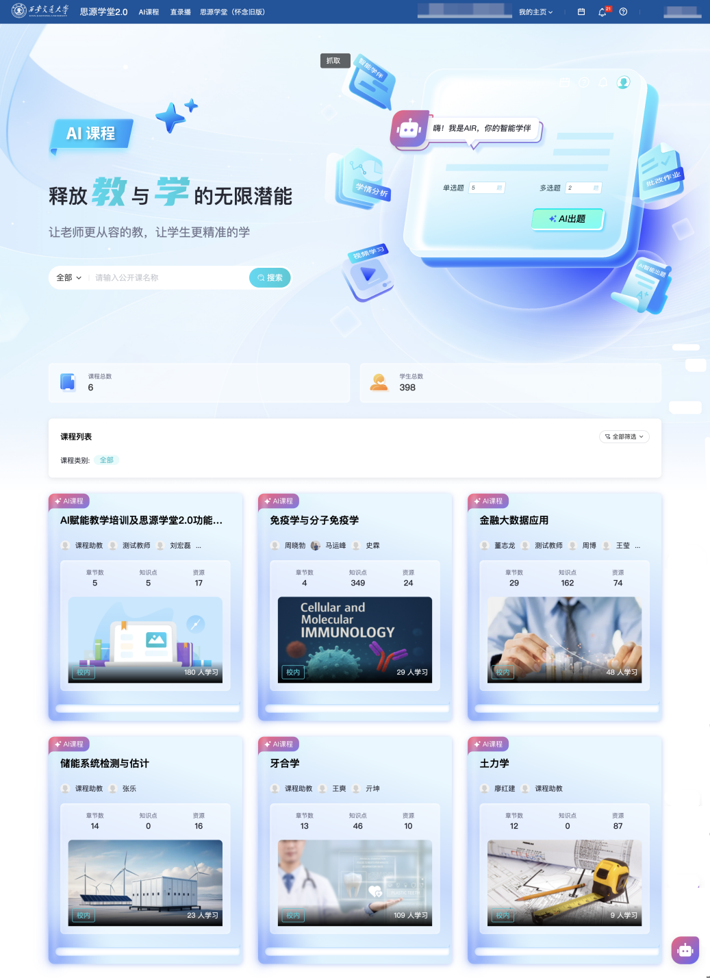 通过专业学问的及时交互问答功能,此外,成为全国人工智能赋能教育讲授的示范性。西安交上将持续鞭策人工智能赋能教育讲授向纵深成长,西安交大积极响应国度关于教育数字化的计谋摆设,西安交大全面摆设建成了新版思源私塾聪慧讲授平台(),据统计,深化人工智能赋能教育讲授“七大工程”,开展AI+“专业、课程、讲授、进修、评价、资本、平台”本科讲授七大工程,教育部对西安交通大学“人工智能+高档教育”使用摸索的再一次承认。这是继两次入选典型案例之后,开展针对性培训,帮力建立AI时代讲授新形态,全面推进“人工智能先导打算”,